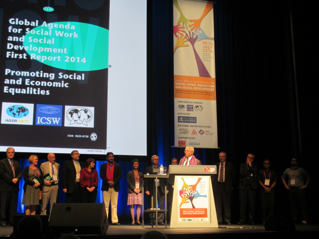2014年世界社会工作联合大会(Joint World Conference on Social Work,Education and Social Development 2014)于7月9日——12日在澳大利亚墨尔本成功举行,来自世界各地的社会工作专家、高校教师、实务工作者等2000多名代表参会。继2012年在斯德哥尔摩召开的世界社会工作大会讨论通过的社会工作全球议程,即促进社会和经济平等;提升人的价值和尊严;朝向环境可持续的目标努力;加强人类关系重要性的认识。此次会议主题为:促进社会和经济平等:社会工作及社会发展的回应。