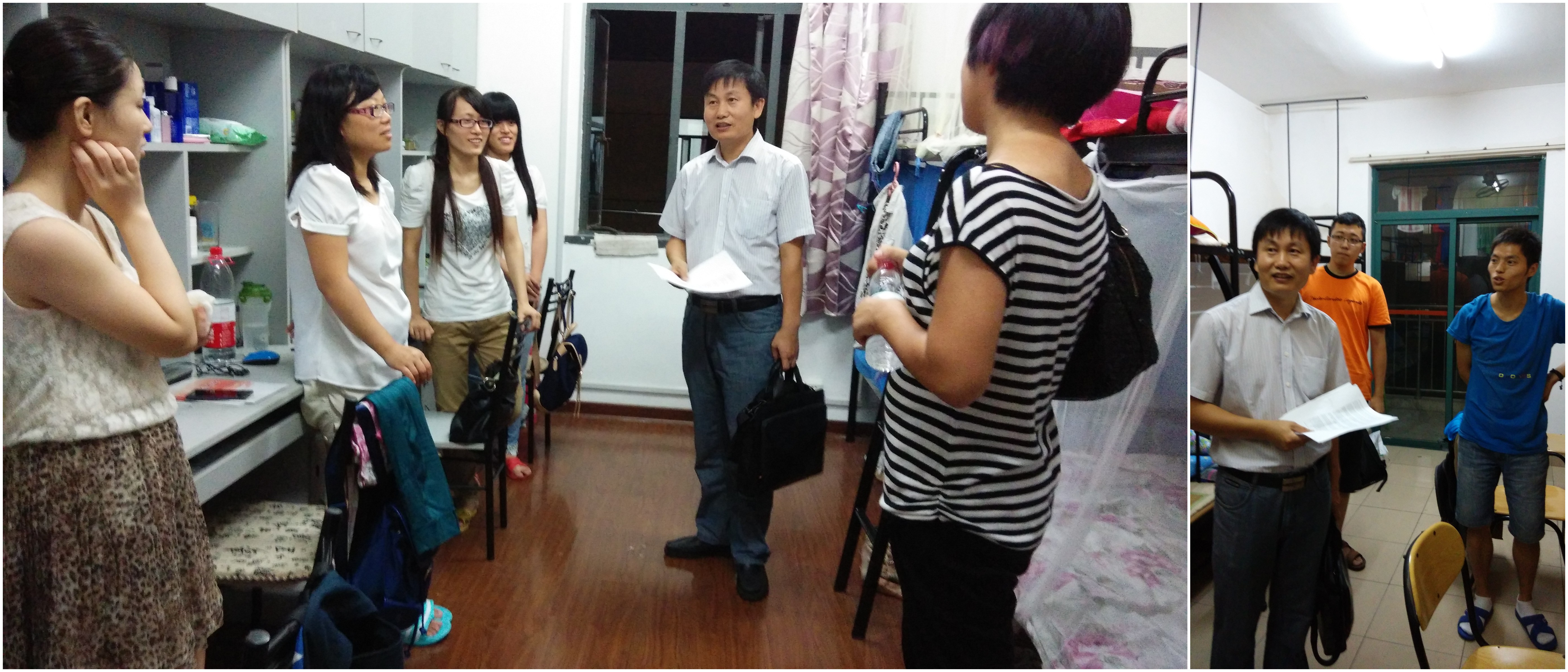 杨发祥老师回忆了自己当年的求学经历,告诫同学们要注重培养自强自立的精神和团队协作的能力。每走进一个学生宿舍,社会学院老师都细致了解14级研究生新生的对学校的感受、学习情况和生活近况,征求对学院教育、管理和服务工作的意见建议,询问他们生活上、学习中存在的困难。例如,关心宿舍的网络是不是很稳定,大家平时的用电情况,外面的人是否能随便进出寝室,以及外出时关好门窗保管好贵重物品等。虽然这些只是一些生活琐事,体现出了社会学院对同学们的关心,希望他们加强自我教育、自我管理、自我服务,努力营造良好舒适的学习生活环境。