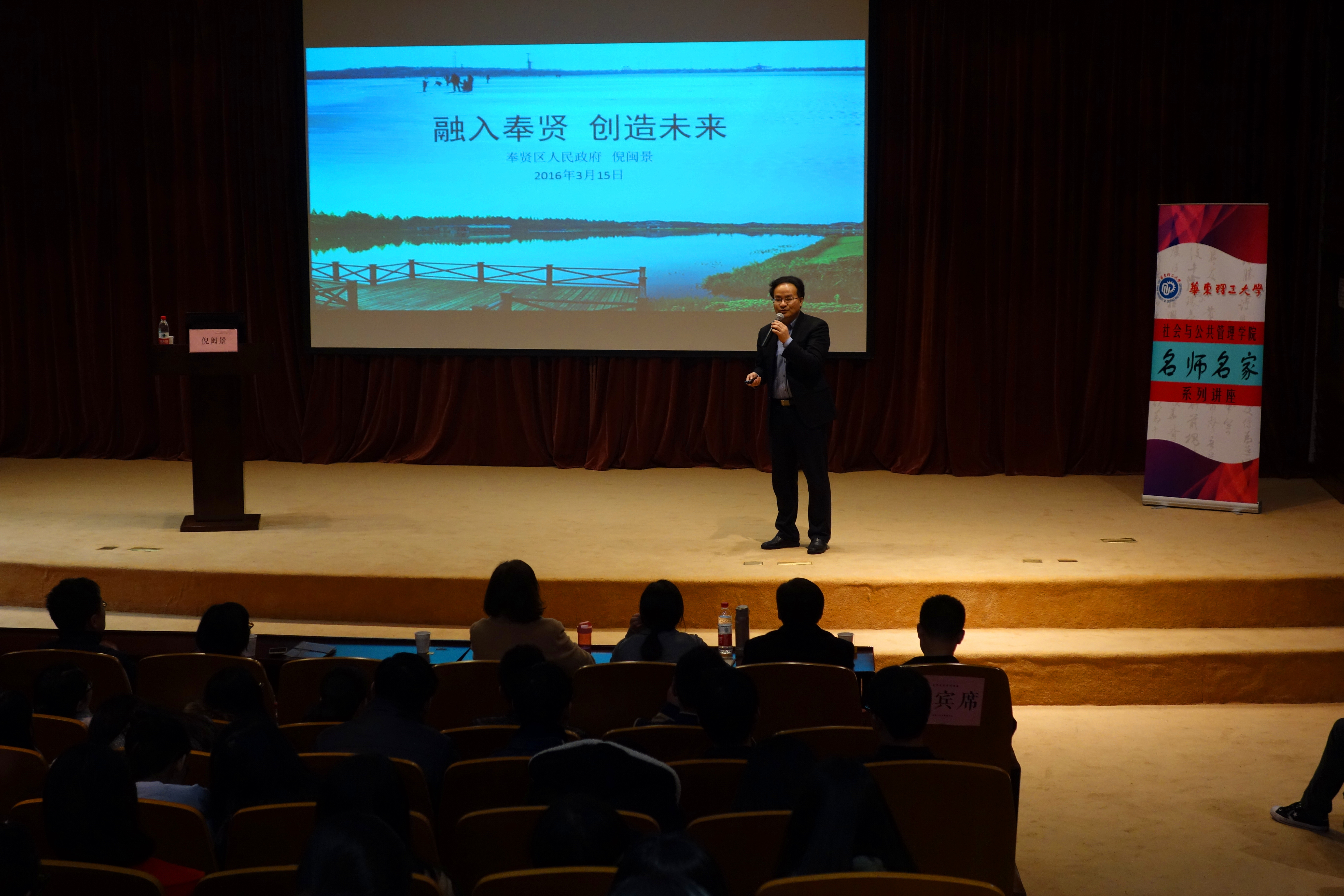 2016年3月15日晚,社会学院名师名家系列讲座第一讲在奉贤校区敬贤堂开讲。本期主讲嘉宾为上海市奉贤区副区长倪闽景,做题为“融入奉贤,创造未来”的主题讲座。参加本场讲座的还有社会学院副院长纪晓岚教授,来自奉贤区南桥镇、海湾镇的青年后备人才、大学生村官及部分机关干部。本场讲座由社会学院党委副书记、学工委主任万胤婕主持。