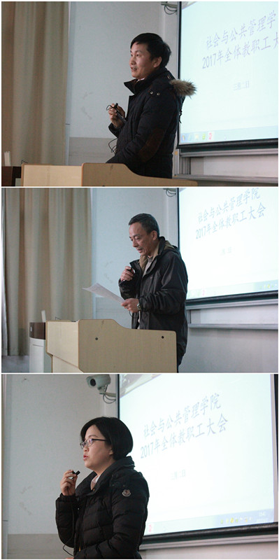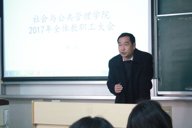 32日下午1500,社会与公共管理学院在四教203隆重举行2017年全院教职工大会。社会学院全体教职工参与,气氛热烈。