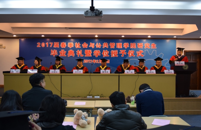 岁月荏苒,花开花灭,又是一年毕业季。2017年2月25日上午,华东理工大学社会与公共管理学院2017届春季研究生毕业典礼暨学位授予仪式在徐汇校区逸夫楼演讲厅隆重举行。社会与公共管理学院何雪松教授、张广利教授、徐永祥教授、曹锦清教授、杨发祥教授、郭圣莉教授、俞慰刚教授、陈丰教授、刘晓亮副教授等领导、导师、教师、部分学生家长以及2017年春季全体博士、硕士毕业生共同见证了这一隆重而神圣的典礼。毕业典礼由杨发祥教授主持。
