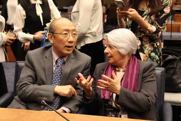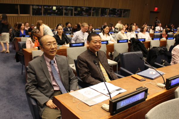 当天,联合国官员以及许多国家驻联合国大使或代表、国际知名学者和社会服务机构负责人欢聚一堂,庆祝本届社会工作日。华东理工大学“上海高校智库”社会工作与社会政策研究院院长、中国社会工作教育协会会长、国际社会工作教育协会常务理事兼国家代表徐永祥教授,率领正在美国访学的我校博士生和博士后人员以及国内其他高校的学者共六人参加了本次活动。当主持人介绍到中国代表团时,全场掌声雷动。见此情景,一些在美华人教授也很激动,纷纷伸出大拇指说道“太棒了”。