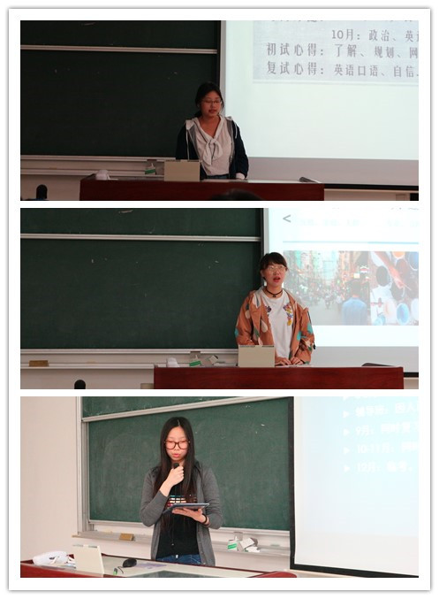 接下来,拿到名校offer的几名学长学姐详细介绍了考研流程,从专业确定、时间安排、考研复习过程中的心态调整、复习计划的制定及考取学校面试流程等环节都分别进行了详细的讲解,他们也结合自身情况分享了考研路上的心得体会,用亲身经历告诉学弟学妹们在考研的道路上要认清自我、明确目标,要坚持不懈、持之以恒,更要耐得住寂寞、坚持自己的道路,他们的分享不仅为备考的大三同学提供了实战经验,也在精神上给予了他们很大的鼓励与支持。他们幽默的语言、生动的讲解,赢得了在场观众的阵阵掌声。