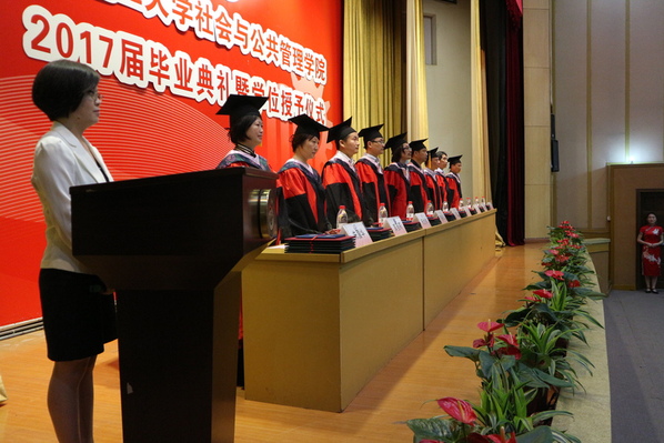 杨发祥宣读《社会学院2017年6月获得博士、硕士学位的学生名单》,授予侯利文等9人博士学位,授予敖云硕士学位。各系副系主任分别宣读了各专业获得学士学位的学生名单,授予许安琪等186人学士学位。在激昂的音乐声中,学院领导为2017届毕业生颁发毕业证书,授予学位,并拨穗正冠。