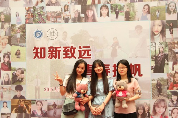 图片说明:带上学院赠送的“毕业小熊”,与同窗好友们在照片墙前合影