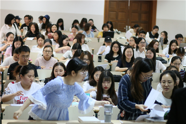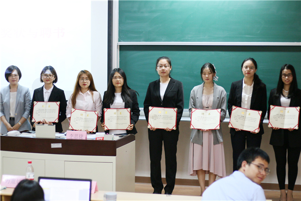 大会颁奖环节,万胤婕、严任舟以及韩伟老师分别为获奖者以及主席团、部长们颁发2017-2018年度社会与公共管理学院研会“优秀个人奖”和2017-2018年度社会与公共管理学院第十三届研会主席团、部长聘书。