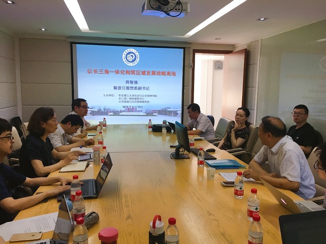 2018615日,我院长三角一体化研究中心、公共政策与公共管理研究所联合举办的长三角一体化系列高层论坛第三讲在社会与公共管理学院322会议室顺利举行。本次论坛邀请了解放日报党委副书记周智强讲座,题目是:以长三角一体化构筑区域发展战略高地。我院长三角一体化研究中心团队全体成员及博士生、研究生参加了会议。会议由长三角一体化研究中心主任纪晓岚教授和公共政策与公共管理研究所所长罗建平教授主持。
