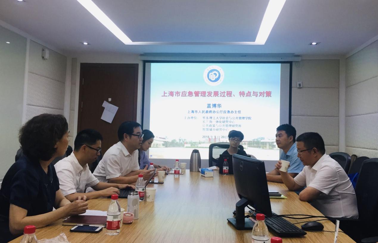 2018920日下午,我院长三角一体化研究中心、公共政策与公共管理研究所以及信息学院智慧城市研究中心联合举办的长三角一体化系列高层论坛第七讲在华东理工大学社会与公共管理学院318会议室顺利举行。本次论坛邀请了上海市人民政府办公厅应急办主任盖博华做题为“上海市应急管理主要经验与对策”的主题报告。我院长三角一体化研究中心主任纪晓岚教授、人文社科处副处长唐有财教授、公共政策与公共管理研究所所长罗建平教授,信息科学与工程学院智慧城市研究中心主任赵文瑜教授,长三角一体化研究中心团队全体成员及博士、研究生参加了会议会议由纪晓岚教授主持。