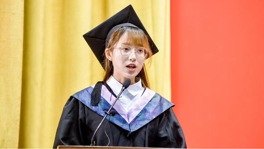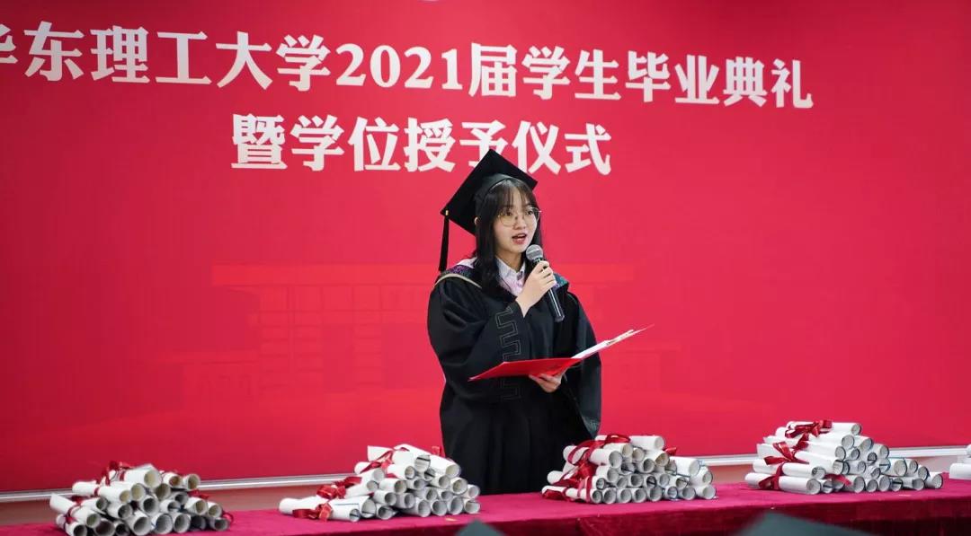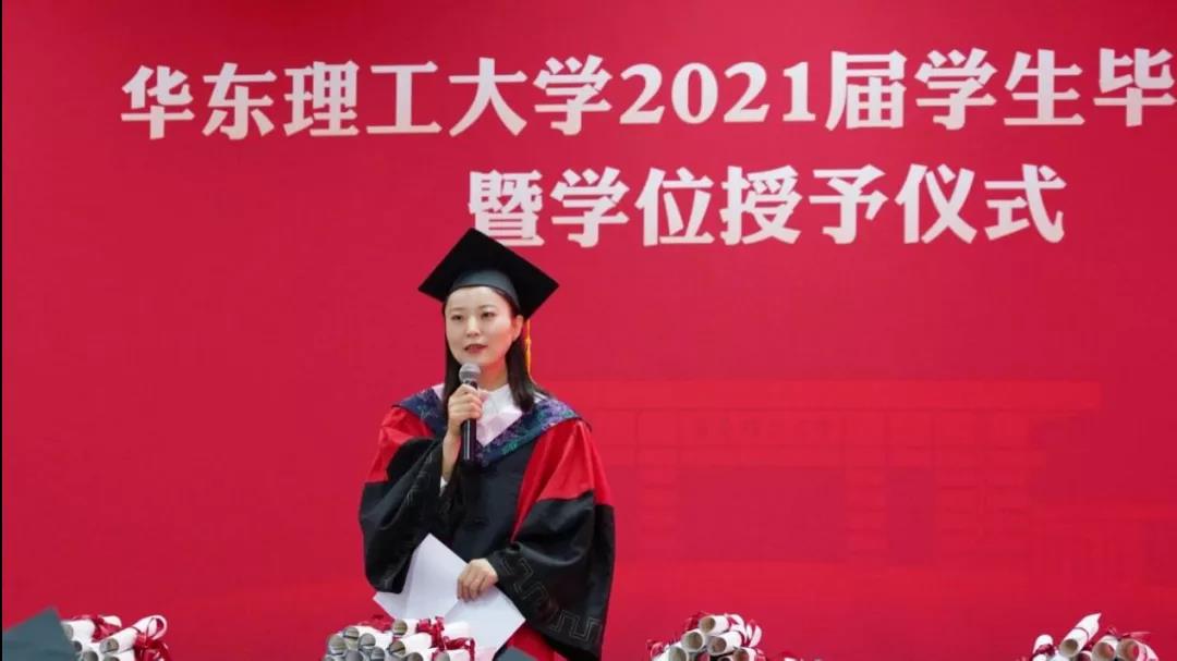 主会场典礼议程结束后,学院毕业典礼正式开始。首先,2021届毕业生代表孙洁开上台发言,她回顾了四年华理生活中的点滴记忆,表达了对母校的感激与不舍。