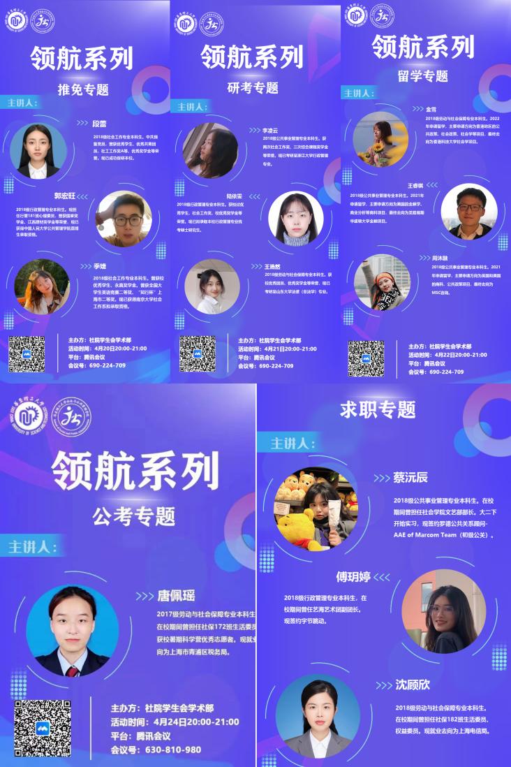 为了帮助本科生清晰自我定位,合理规划未来发展路径,了解升学、就业的相关知识,拓宽相关信息来源的渠道,为同学们进行答疑解惑,助力成才发展,社会与公共管理学院于4月21日至4月25日连续举办五场发展领航系列经验交流分享会,分为研究生推免、考研、留学、求职及公务员考试五个分会场,五场在线参与人次累计超过2000人次,聆听朋辈经验,助力梦想启航。