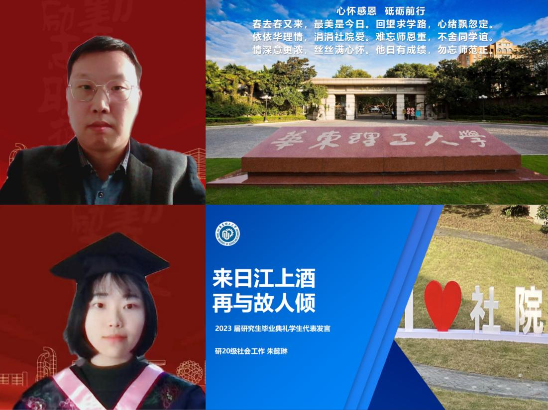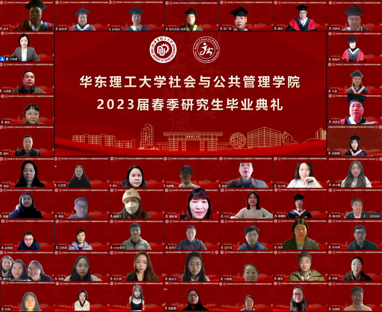 2023年1月11日上午9:00,华东理工大学社会与公共管理学院2023届毕业典礼以在线直播形式隆重举行。研究生院副院长刘涛、院党委书记张广利、院长何雪松、学院党政班子成员、学位授权点导师组组长以及学院教师代表与2023届毕业生相聚云端。毕业典礼由院党委副书记万胤婕主持。