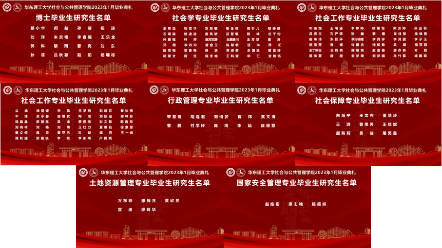 研究生院副院长刘涛宣读博士毕业研究生名单,杨发祥老师宣读社会学专业毕业研究生名单,费梅苹老师宣读社会工作专业毕业研究生名单,刘晓亮老师宣读行政管理专业毕业研究生名单,龚秀全老师宣读社会保障专业毕业研究生名单,牛星老师宣读土地资源管理专业毕业研究生名单,陈丰老师宣读国家安全管理专业毕业研究生名单。