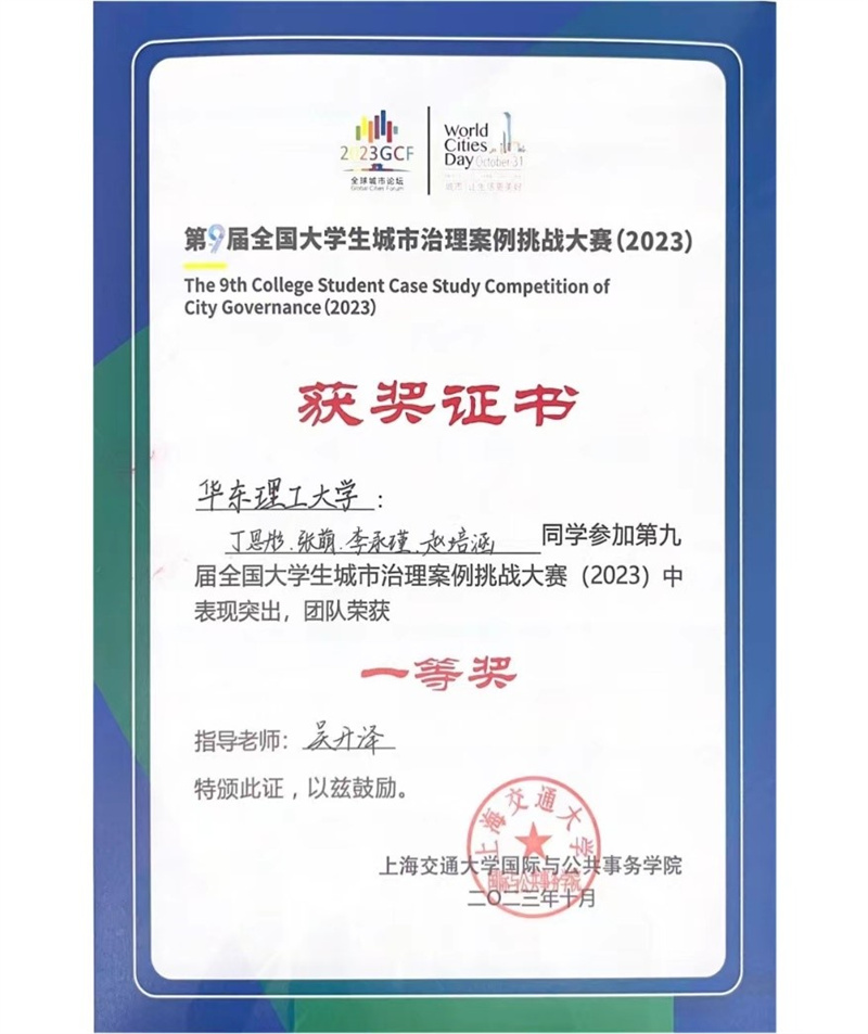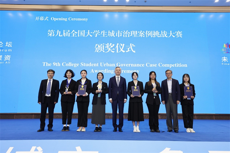 2023年10月29日,在上海市闵行区大零号湾会议中心举行的2023全球城市论坛上,举行了“第九届全国大学生城市治理案例挑战大赛(2023)”颁奖仪式。上海交通大学原党委书记、中国城市治理研究院名誉院长姜斯宪,上海交通大学上海高级金融学院执行理事、上海新金融研究院理事长屠光绍,上海市闵行区委副书记、区长陈华文为获得一等奖的团队颁奖。